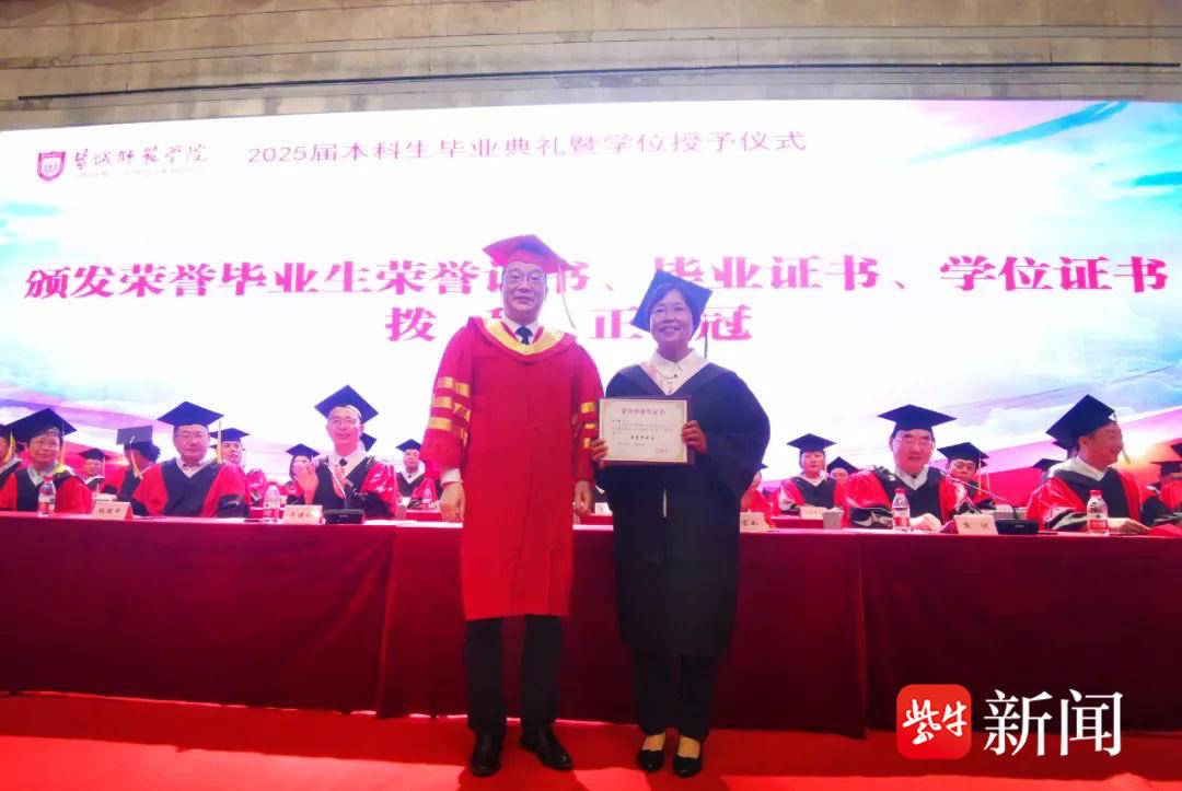 6月16日,在盐城师范学院2025届本科生毕业典礼上,60岁的朝鲜语专业毕业生陈立敏成为全场焦点。作为本届唯一“荣誉毕业生”,她庄重地从校领导手中接过证书。花白鬓角与青春场景形成独特映照,无声诉说着这位本届最年长本科生跨越年龄的求学路。荣誉背后,是她凭借韩国语能力考试(TOPIK)中级证书、韩国清州大学“优等生一等奖”等优异成绩,为四年本科生涯画上的圆满句号,也成为毕业典礼最动人的励志注脚。